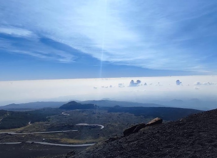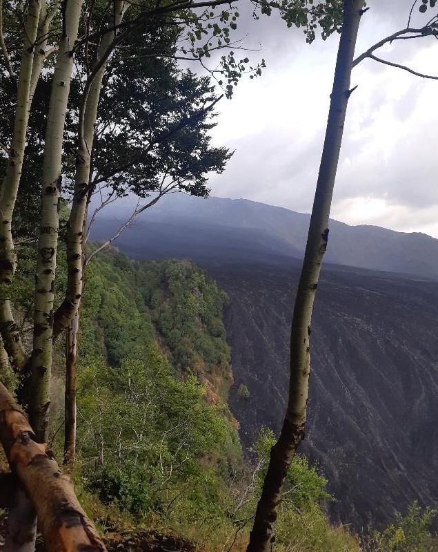 Nachdem Sie den Wald durchquert haben, erblicken Sie bereits die erste tolle Aussicht Richtung Süden, die Hänge von Catania und die ionische Küste. Sie wandern durch eine völlig offene Landschaft, durch alte Lavaströme und durch typische Ätna-Vegetation wie Saponaria, Astragalus, Veilchen und Kamille. Seien Sie vorsichtig mit dem Astragalus. Die großen kissenartigen Klumpen, die dieser Strauch im Felsen bildet, laden zum Ausruhen ein, aber am Ende kann es sein, dass Sie voller Stacheln sind!