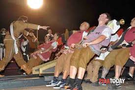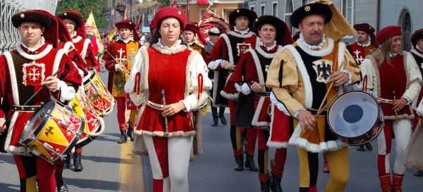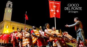 Heute dagegen kämpfen die 2 Mannschaften wesentlich friedvoller auf der Ponte di Mezzo, um "die Brücke" zu erobern. Ein riesiges Gestell mit Schiene wird aufgebaut und die Mannschaften versuchen sich gegenseitig von der Brücke runterzuschieben. Auch in diesem Fall haben wird natürlich vorher eine fantastische Parade durch die Stadt, mit 750 Teinehmern, davon sind 41 auf den Pferden organisiert. Die Kostüme sind in diesem Fall, die der spanischen Soldaten 1500.