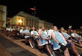 mit Fahnenschwängern und Trommlern durch die Stadt, da es jetzt mit den Ruderbooten gegen die Strömung des Arno´s, um die Wette geht. Die Stadt ist in Viertel geteilt, Santa Maria - hellblau, San Francesco - gelb, Sant´Antonio- grün und San Martino -rot, die jetzt jeweils mit ihren Booten versuchen, als Erster das Boot mit dem Palio (ein Seidenbanner mit dem Bildnis des Hl. Ranieri) zu erobern.