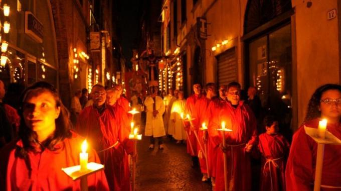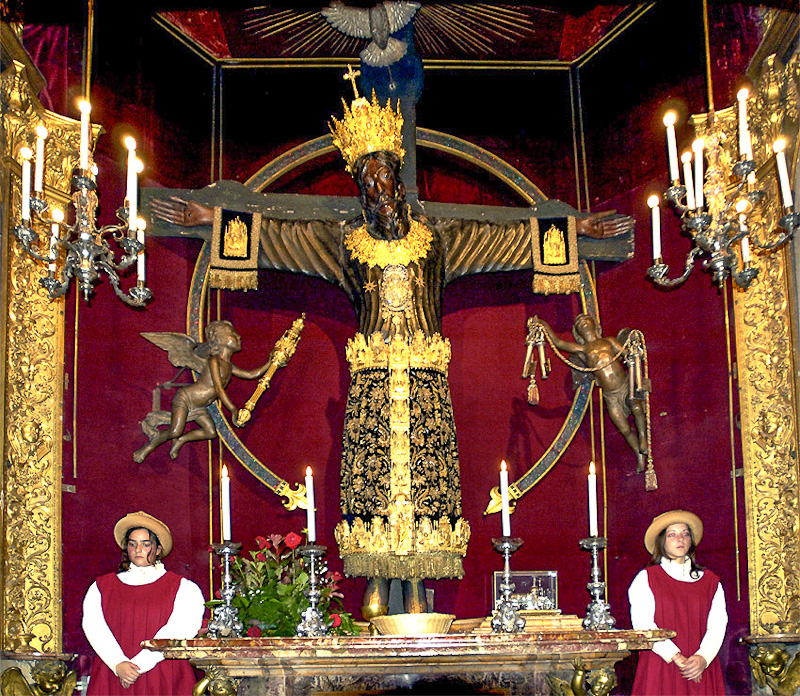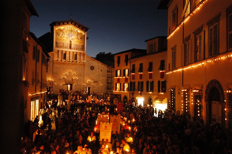 Volto Santo ist für einen Italiener das „Heilige Antlitz“, bzw. ein 2,24 x 2,65 m großes hölzernes Jesuskreuz, welches in der Kathedrale von Lucca, in einem kleinen Tempel bewahrt wird. Jeden 13. September wird ihm zu Ehren eine Prozession von der Basilika San Frediano bis zur Kathedrale San martino durch die Stadt gemacht. Gegen 20 Uhr geht es los und zu diesem Anlass werden sämtliche Häuser und Paläste mit „Lumini“ – Kerzenlichtern beleuchtet. In deer Kahtedrale findet dann der „Mottettone“ statt, bzw. jedes Jahr von luccheser Musikern neu komponiert, eine polifonische Komposition für Instrumente und Gesang. Begleitet wird dieses Ereignis von mehreren Veranstaltungen, Markt und Musik. Dieses Kreuz wird schon seit dem 11. Jahrhundert sehr verehrt, als Lucca am Pilgerweg Europa´s lag und jeder Pilger hier ein Gebet „dem einzigen wahren Antlitz des Herren“ leisten musste. Die Legende erzählt nämlich, das dieses Kreuz vom Nikodemus, Freund es Jesus geschnitzt wurde und als er müde, eingeschlafen war, machten die Engel für ihn das Gesicht fertig. Auf „wunderbare“ Art und Weise kam dieses Kreuz in die Stadt Lucca, durch Willen Gottes und so wird es seit Jahrhunderten verehrt.