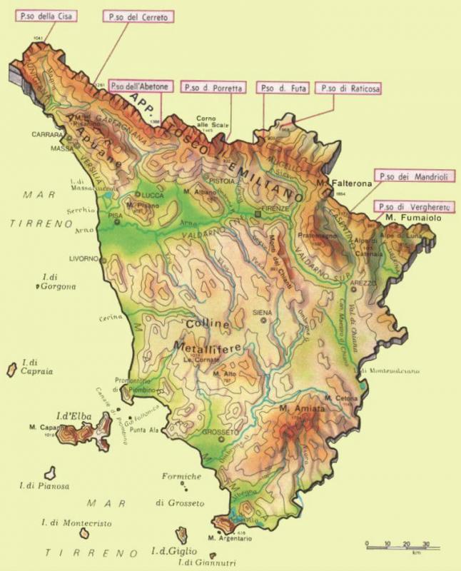 Auch die Berge der Toskana sind unterschiedlich, da die Appeninkette vom Norden, von Ligurien erst einmal parallel zur Küste verläuft, wo sie Apuanische Alpen genannt wird. Dieser schöne Name kommt von der Form und Farbe, da die Bergspitzen das ganze Jahr über weiß bleiben. Hier befindet sich eines der größten Marmorfelder der Welt und die kleine Stadt zu Füssen der Berge gibt den Namen: Carrara. Dieses Gebiet ist fantastisch zum trekken und klettern, da die Berge allerdings fast 2000 m Höhe erreichen, muß man schon ein bißchen trainiert sein. Die Bergkette macht dann einen Schlenker landeinwärts und verläuft hinter Lucca und Pistoia mit dem schönen Wander/Trekkinggebieten durch die Garfagnana, Svizzera Pesciatina, Monti Pistoiesi, zum Mugello hinter Florenz, um dann Richtung Süden weiterzugehen bis zum Monte Amiata. Hier gibt es die wunderschönen Kastanien- und Buchenwälder. Diese Berge sind im Sommer Paradies der Naturfreunde und im Winter der Skifahrer.