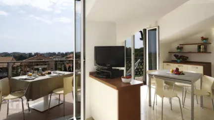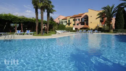 Diese Ferienunterkunft bietet alles für einen unbeschwerten Familienurlaub für 6 Personen (4+2 Pers.). Es gibt einen Pool mit separatem Kinderbecken, eine Bar für Kaffee und Eis sowie viel Platz zum Spielen mit Tischtennis, Tischfußball und einem Volleyballfeld. Im Juli und August werden bei ausreichender Nachfrage lustige Kinderaktivitäten für die jüngsten Gäste organisiert. Die Apartments sind auf zwei Etagen verteilt und verfügen über ein helles Wohnzimmer mit Fernseher und Schlafsofa, eine Küchenzeile, ein Schlafzimmer mit Doppelbett und ein Badezimmer mit Dusche. Auf der Empore befinden sich zwei weitere Einzelbetten. Im Außenbereich gibt es einen Balkon mit Sitzgelegenheit oder eine kleine Dachterrasse: ideal, um abends noch die milde Meeresluft zu genießen.