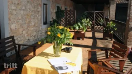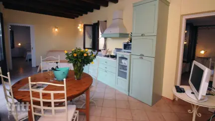 Die Dreizimmerwohnung im Erdgeschoss bietet ein Wohnzimmer mit Essbereich und Doppelsofa, eine Küche und je nach Grundaufteilung zwei bis drei Schlafzimmer für bis zu 6 Personen. Das Badezimmer verfügt über Dusche und Toilette, und draußen findet man eine überdachte private Terrasse oder einen Balkon. Einige Wohnungen bieten die Möglichkeit eines zusätzlichen Bettes im zweiten Schlafzimmer. Alle Wohnungen sind klimatisiert. Zur Entspannung gibt es ein Schwimmbad und ein separates Kinderbecken, während die Kleinen auf dem Spielplatz oder auf dem Spielplatz Spaß haben. Am Abend können Sie im Restaurant lokale Gerichte genießen, begleitet von Weinen des eigenen Anwesens. Es gibt eine wöchentliche Weinverkostung, und die Weine sind zu Hause erhältlich.
