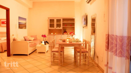 Die Wohnung befindet sich im Erdgeschoss und bietet einen Wohnbereich mit Esstisch, eine Küchenzeile mit Geschirr, Besteck, Geschirrspüler, Mikrowelle, Toaster und Wasserkocher, einen Fernseher, ein Doppelsofa und zwei Schlafzimmer mit Doppelbett. Das Badezimmer verfügt über Dusche oder Badewanne, Toilette und Bidet. Draußen befindet sich eine möblierte Terrasse mit Blick auf den Garten, wo man frühstücken oder in Ruhe entspannen kann. Alle Wohnungen sind mit Klimaanlage und Moskitonetze ausgestattet. Am Pool sind für jede Wohnung zwei Sonnenliege und ein Sonnenschirm reserviert.
