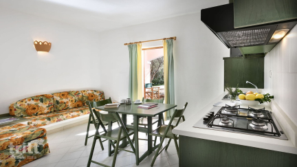 Der Park fühlt sich wie ein kleines Dorf an, mit Hotelzimmern, Apartments und luxuriösen Ferienhäusern. Die Apartments sind um ein gemeinsames Schwimmbecken herum angelegt und verfügen alle über eine private Terrasse oder einen Balkon. Die 6-Personen-Wohnung besteht aus einem Wohnzimmer mit zwei Einzelsofas, einer Küchenecke und zwei Schlafzimmern, eines mit Doppelbett und eines mit zwei Einzelbetten. Das Badezimmer verfügt über Dusche und Haartrockner, draußen befindet sich eine Terrasse oder ein Balkon mit Sitzgelegenheiten. Ein Babybett kann hinzugefügt werden. Im Park finden Sie alles, um den Tag zu entspannen: eine Pizzeria, eine Bar, einen Tennisplatz und einen Volleyballplatz. Abends kann man das Restaurant mit täglichem Buffet besuchen oder, auf Reservierung, im Restaurant auf der Höhe mit einem wunderschönen Blick über die Bucht und die Insel Caprera. Für Familien ist der Strand gegenüber ideal: sanft abfallend und ausgestattet mit Sonnenliege und Sonnenschirmverleih. Ein Shuttlebus fährt ebenfalls vom Park zu den Stränden in der Gegend, und man kann direkt Ausflüge zu den Inseln von La Maddalena buchen.