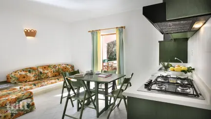 Der Park fühlt sich wie ein kleines Dorf an, mit Hotelzimmern, Apartments und luxuriösen Ferienhäusern. Die Apartments sind um ein gemeinsames Schwimmbecken herum angelegt und verfügen alle über eine private Terrasse oder einen Balkon. Die 6-Personen-Wohnung besteht aus einem Wohnzimmer mit zwei Einzelsofas, einer Küchenecke und zwei Schlafzimmern, eines mit Doppelbett und eines mit zwei Einzelbetten. Das Badezimmer verfügt über Dusche und Haartrockner, draußen befindet sich eine Terrasse oder ein Balkon mit Sitzgelegenheiten. Ein Babybett kann hinzugefügt werden. Im Park finden Sie alles, um den Tag zu entspannen: eine Pizzeria, eine Bar, einen Tennisplatz und einen Volleyballplatz. Abends kann man das Restaurant mit täglichem Buffet besuchen oder, auf Reservierung, im Restaurant auf der Höhe mit einem wunderschönen Blick über die Bucht und die Insel Caprera. Für Familien ist der Strand gegenüber ideal: sanft abfallend und ausgestattet mit Sonnenliege und Sonnenschirmverleih. Ein Shuttlebus fährt ebenfalls vom Park zu den Stränden in der Gegend, und man kann direkt Ausflüge zu den Inseln von La Maddalena buchen.