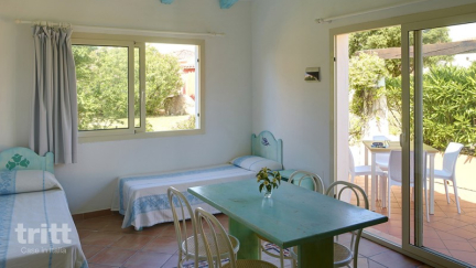 Die 6-Personen-Wohnung besteht aus einem hellen Wohnzimmer mit Essbereich und Kochnische, 4-Kochplatte, Spüle und Kühlschrank, sodass Sie nach einem Tag am Meer problemlos eine Mahlzeit zubereiten können. Die zwei Doppelschlafzimmer bieten viel Privatsphäre und dank der zwei Badezimmer mit Dusche ist der Aufenthalt für mehrere Gäste angenehm. Das Wohnzimmer verfügt über zwei Einzelbetten und die Klimaanlage sorgt für Kühlung an heißen Tagen. Draußen blickt man von der eigenen Veranda aus auf das Grün, mit Platz zum Essen und Entspannen. Zu Fuß erreichbar befinden sich ein Schwimmbad mit Panoramablick, ein zweites Schwimmbecken im Restaurant und ein Kinderspielplatz, was den Aufenthalt für Familien besonders angenehm macht.