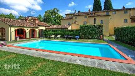 Draußen befindet sich ein großer Garten mit einem privaten Schwimmbad, einem großzügigen Rasen und hohen, blühenden Bäumen. Der Garten ist teilweise gepflastert und bietet viel Raum zum gemeinsamen Entspannen. Vom Garten aus kann man direkt zum Fluss Arno gehen.