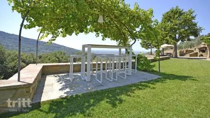 Diese Villa bietet Platz für 8 Personen und besteht aus einem Haupthaus und einem Anbau wenige Meter entfernt. Das Hauptgebäude hat zwei Stockwerke und ist für 6 Personen geeignet. Im Erdgeschoss befindet sich das Wohnzimmer mit Sitzecke, Kamin und Satellitenfernsehen, gefolgt von einer offenen Küche mit Kücheninsel. Die Küche ist vollständig ausgestattet mit einem großen Kühlschrank mit Gefrierfach, Geschirrspüler, Ofen/Mikrowelle, Filterkaffeemaschine und Espressomaschine, ergänzt durch einen runden Speisebereich. Der erste Stock verfügt über drei Schlafzimmer, darunter ein geräumiges Hauptschlafzimmer mit Doppelbett, Lounge-Sofa, Badezimmer und Doppelwaschbecken, ergänzt durch eine separate Dusche und Toilette. Außerdem gibt es zwei Schlafzimmer mit einem Doppelbett und ein gemeinsames Badezimmer mit Dusche, Waschbecken und Toilette. Der Anbau verfügt über ein Doppelzimmer und ein privates Bad mit Dusche, Waschbecken und Toilette, ideal für alle, die etwas mehr Privatsphäre suchen. Draußen befindet sich das private Schwimmbad neben der Villa, das über Steinstufen erreichbar ist, mit römischen Treppen, einer Außendusche und Sonnenbetten. Über den Garten verteilt sind mehrere Terrassen und Sitzbereiche, darunter eine Steinterrasse mit Esstisch und ein Grill mit Holzofen. WLAN, Moskitonetze, Waschmaschine, Trockner und mitgelieferte Poolhandtücher bieten zusätzlichen Komfort. Bett-, Badezimmer- und Küchenwäsche sind ebenfalls enthalten und werden wöchentlich gewechselt. Ein Feldbett ist auf Anfrage kostenlos erhältlich.
