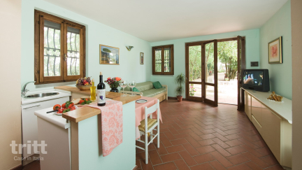 Die Domäne verfügt über fünf Wohnungen im einfachen toskanischen Stil, jede mit einer eigenen Terrasse zum Essen im Freien. Die Wohnung verfügt über einen gemütlichen Wohnbereich mit einem Einzelsofa und eine einfache Kochnische mit einem elektrischen Kochfeld mit zwei Kochplatten, einem kleinen Ofen und einem Kühlschrank. Das Schlafzimmer hat ein Doppelbett und grenzt an ein Badezimmer mit Dusche. Draußen gibt es eine private Terrasse mit Sitzgelegenheiten, ideal zum Frühstück in der Morgensonne oder abends zu einem Glas Wein. Obwohl es keine Klimaanlage gibt, bleibt die Wohnung aufgrund ihrer Lage und dicken Wände angenehm kühl. Die Besitzer selbst leben auf dem Anwesen und empfangen ihre Gäste mit großer Herzlichkeit. Die Küche ist das Herzstück dieses Aufenthalts. Der Gastgeberin kocht jeden Abend ein saisonales toskanisches Gericht mit Zutaten aus seinem eigenen Land, während die Gastgeberin sich um die Desserts kümmert. Sobald die Sonne scheint, wird das Abendessen draußen serviert: an Tischen auf der Terrasse neben dem Pool, mit Blick auf das Land und die dahinterliegenden Hügel.