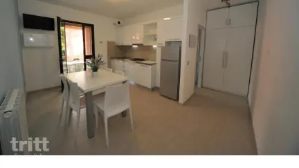 Die Wohnung befindet sich im Erdgeschoss und ist praktisch möbliert, mit einem hellen Wohnzimmer, einer Kochnische, einem Doppelbett und einem Einzelbett. Das Badezimmer verfügt über eine Dusche und die private Terrasse ist mit Gartenmöbeln ausgestattet. Das Schwimmbad befindet sich zentral im Garten, verfügt über ein Kinderbecken und verschiedene Spielmöglichkeiten. Die Bar im Park ist ein angenehmer Ort zum Frühstück, einem Drink oder einem einfachen Snack. Dank seines kleinen Maßstabs wirkt das Gelände persönlich und entspannt, ideal für alle, die in der Nähe des Strandes und der Natur bleiben möchten.