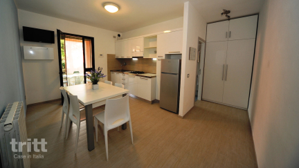 Die geräumige Wohnung besteht aus zwei miteinander verbundenen Teilen, ideal für größere Familien oder Gäste, die etwas mehr Privatsphäre wünschen. Das Wohnzimmer verfügt über eine Kochnische, einen Essbereich und einen Fernseher, während die drei Schlafzimmer sich über beide Teile des Ferienhauses erstrecken. Es gibt 2 Badezimmer und 2 private Terrassen mit Blick auf den Garten, was den Aufenthalt sowohl drinnen als auch draußen angenehm macht. Die helle Einrichtung und das viele Grün rundherum schaffen eine entspannte Atmosphäre.
