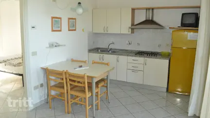 Der breite Sandstrand von Straccoligno ist 1,7 km entfernt und ideal für Familien dank des sanft abfallenden Wassers. Strandbetten können tagsüber oder wöchentlich gemietet werden, und Sie können in die Strandbar gehen, um ein kühles Getränk oder ein Eis zu bekommen. Die fünf-Personen-Wohnung mit drei Zimmern befindet sich im Erdgeschoss und verfügt über eine überdachte private Terrasse. Im Inneren finden Sie einen Wohnbereich mit Essbereich, Fernseher und Einzelsofa, eine Küche mit Herd, Kühlschrank und Filterkaffeemaschine, zwei Doppelzimmer (einige mit Einzelbetten) und ein Badezimmer mit Dusche. Wohnung Nr. 17 verfügt über ein Doppelzimmer und ein Schlafzimmer mit drei Einzelbetten. Alle Typ-B-Wohnungen sind klimatisiert.