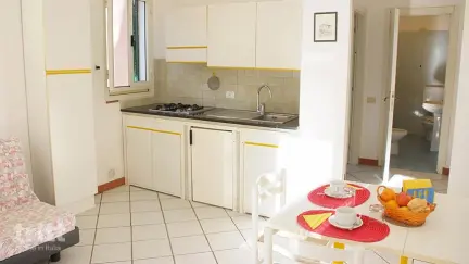 Dieses Ferienhaus für 4 Personen befindet sich im Haupthaus am Pool oder in einem der Landhäuser zwischen den Kiefern. Die Wohnung verfügt über einen Wohnbereich mit einer einfachen Kochnische, einem 4-Platten-Herd, einem Kühlschrank und einer italienischen Kaffeemaschine sowie einem Doppelsofa. Außerdem gibt es ein Schlafzimmer und ein Badezimmer mit Dusche. Draußen finden Sie eine gepfeilte Terrasse, die offen oder überdacht sein kann. Der Park bietet verschiedene Einrichtungen für Jung und Alt: ein Schwimmbad mit Kinderbecken, einen Spielplatz, Tennis, Tischtennis und einen Fitnessraum. Ein Restaurant ist etwa 100 Meter entfernt und der Strand ist mit dem Fahrrad leicht zu erreichen.