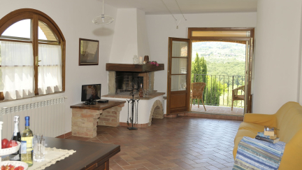 Die Wohnung befindet sich in einem charakteristischen Landhaus und verbindet Charme mit Komfort. Das Wohnzimmer mit offener Küche bildet das Herz des Hauses und bietet Zugang zu einem attraktiven Außenbereich unter einer Steineiche, von wo aus man auf die toskanischen Hügel blickt. Es gibt zwei Schlafzimmer, ein gepflegtes Badezimmer und die Küche ist vollständig ausgestattet für einen sorglosen Aufenthalt. Dank der großzügigen Terrasse und der schönen Aussicht fühlt sich dieses Ferienhaus wie eine wunderbare Basis für entspannte Tage am Pool oder einen Abend mit einem guten Glas Wein aus der Region an.