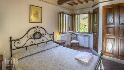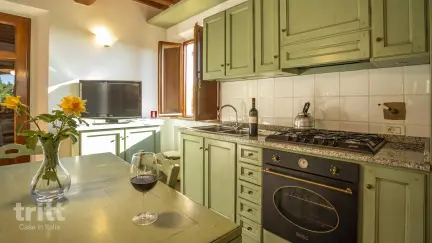Ein großer Teil des Geländes ist speziell für Gäste eingerichtet. Die Apartments befinden sich im historischen Bauernhaus und einigen charakteristischen Nebengebäuden. Sie sind im traditionellen Stil mit Cotto-Böden, Balkendecken und originalen Details gebaut. Dieses geräumige Apartment befindet sich im Obergeschoss und ist über eine steinerne Außentreppe erreichbar. Im Inneren finden Sie ein helles Wohnzimmer mit Küchenecke, Esstisch und einem Doppelschlafsofa. Es gibt zwei Schlafzimmer: eines mit einem Doppelbett und einem eigenen Badezimmer mit Badewanne und eines mit zwei Einzelbetten. Darüber hinaus gibt es ein zweites Badezimmer mit Dusche. Draußen erwartet Sie eine schöne überdachte Terrasse mit Bögen, ideal zum Frühstücken oder Abendessen mit Blick auf die toskanische Landschaft. Für eine 5. und 6. Person wird ein Aufpreis berechnet.