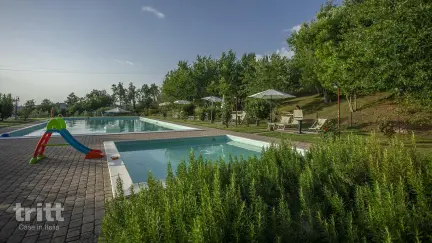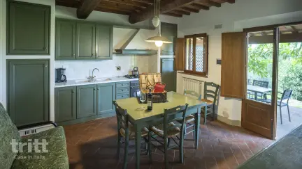 Das Anwesen umfasst mehr als 48 Hektar, auf denen Oliven, Trauben, Getreide und andere Pflanzen vollständig biologisch angebaut werden. Die Trauben werden hier zu hochwertigen Weinen und Grappa verarbeitet, während die Oliven ein außergewöhnliches selbstangebautes Olivenöl liefern. Auf dem Gelände befindet sich ein historisches Bauernhaus, das zu mehreren attraktiven Wohnungen umgebaut wurde. Diese geräumige Dreizimmerwohnung befindet sich im Erdgeschoss und befindet sich in einem ehemaligen Nebengebäude des Hofes. Drinnen finden Sie ein gemütliches Wohnzimmer mit Kochnische und Essbereich. Das erste Schlafzimmer verfügt über ein Doppelbett und ein angrenzendes Badezimmer mit Badewanne. Das zweite Schlafzimmer hat zwei Einzelbetten und es gibt ein zusätzliches Badezimmer mit Dusche. Dank des Doppelsofas im Wohnzimmer können hier bis zu sechs Personen bequem übernachten. Draußen verfügt die Wohnung über eine überdachte Terrasse mit Pergola und einen wunderschönen Blick über den Pool und die grüne Landschaft. Es ist ein wunderschöner Ort, um in der Morgensonne zu frühstücken oder abends einen toskanischen Wein vom Anwesen selbst zu genießen. Zentral auf dem Anwesen befindet sich ein Salzwasser-Schwimmbecken mit einer großzügigen Sonnenterrasse und bequemen Sonnenliegen. Von hier aus kann man über die umliegenden Hügel blicken, die so typisch für diesen Teil der Toskana sind. Es ist ein wunderbarer Ort, um nach einem Tag voller Sightseeing zu entspannen oder einfach die Aussicht und Stille der toskanischen Landschaft zu genießen. Über das gesamte Anwesen verteilt finden Sie Wälder, Weinberge, kleine Seen und mehrere Wanderwege, die miteinander verbunden sind. Wer mehr über das Anwesen erfahren möchte, kann in der Hochsaison an besonderen Aktivitäten teilnehmen, wie Führungen durch die Weinberge, Verkostungen oder Yogakurse unter den Olivenbäumen, stets mit ausreichender Beteiligung.