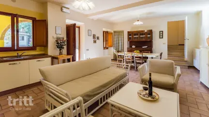 Dieser charaktervolle Ferienhof besteht aus mehreren Wohnungen, die über das Anwesen verteilt sind. Die Wohnung für 4 Personen befindet sich im Erdgeschoss und ist geräumig und komfortabel eingerichtet. Im Inneren finden Sie ein helles Wohnzimmer mit Sofa, Essbereich, Kamin und einer praktischen Küchenecke. Es gibt zwei Schlafzimmer, eines mit einem Doppelbett und eines mit zwei Einzelbetten, sowie ein ordentliches Badezimmer mit Dusche. Draußen verfügt die Wohnung über einen kleinen überdachten Balkon mit Tisch und Stühlen, ideal zum Genießen der toskanischen Luft. Auf dem Grundstück befindet sich ein 6 x 12 m großes Schwimmbecken, in dem Wein und natives Olivenöl extra produziert werden.