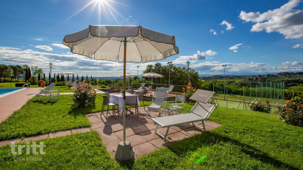 Zwischen den Hügeln von Chianti in Italien, am Ende einer langen Zypressenallee, liegt ein ruhiges Anwesen, das die Atmosphäre der klassischen Toskana ausstrahlt. Umgeben von Weinbergen, Weizenfeldern, Olivenhaine und ruhigen Wäldern fühlt es sich an wie ein Ort, an dem man sich nahtlos in die Landschaft einfügt. Es ist eine idyllische Umgebung, in der Familien, Paare und Kinder sich schnell wie zu Hause fühlen.
