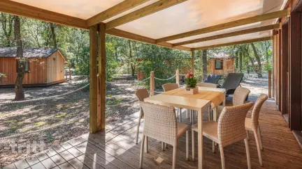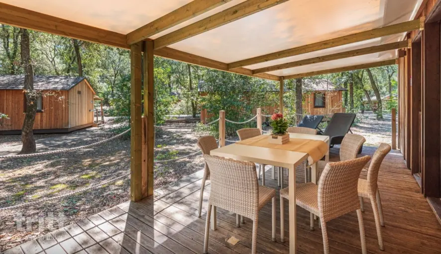 Auf dem autofreien 36-Hektar-Gelände befinden sich moderne Chalets zwischen den Kiefern. Das Chalet (6+1 Personen) verfügt über ein Wohnzimmer mit Essbereich und Kochnische (Herd, Kombi-Mikrowelle, Kühlschrank mit Gefrierschrank, Moka), zwei Schlafzimmer mit jeweils einem Doppelbett (160×190), ein Schlafzimmer mit Etagenbetten und 2 Bäder mit Dusche, Toilette, Waschbecken und Föhn. Draußen befindet sich eine 30 m² große Veranda mit Tisch, 8 Stühlen, 2 Sonnenliege und 2 Liegestühlen. Klimaanlage, Moskitonetze und WLAN sind verfügbar. Ein Feldbett oder ein Feldbett kann auf Anfrage hinzugefügt werden. Der Park verfügt über einen privaten Strand, an dem Sie Sonnenbänken und Sonnenschirme mieten können, 2 Schwimmbäder (375 m² und 210 m²) sowie 4 Whirlpools. Am Strand findet man eine Strandbar für Snacks und Getränke, und am großen Pool eine Poolbar, in der morgens auch Frühstück angeboten wird. Es gibt zahlreiche Aktivitäten wie Aerobic, Aquagym, Tennis, Beachvolleyball, Fußball, Windsurfen, Paddleboarding, Kanufahren und Katamaranverleih. Für Kinder gibt es Clubs von 3 bis 16 Jahren, Spielbereiche und tägliche Unterhaltung. Im Park findet man eine Pizzeria (ebenfalls glutenfreie Optionen), ein Buffet, ein à-la-carte-Restaurant am Meer und einen Supermarkt. Die Zahlung ist einfach mit einem Armband, das mit Ihrer Kreditkarte verknüpft ist.