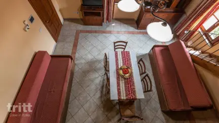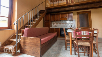 Die Wohnung befindet sich im Erdgeschoss und bietet einen hellen Wohnbereich mit Kochnische und einem bequemen Schlafsofa. Es gibt zwei Badezimmer und zwei Schlafzimmer, eines mit einem Doppelbett und eines mit zwei Einzelbetten. Über eine Treppe erreicht man das offene Schlafloft mit zwei zusätzlichen Betten, ideal für größere Familien. Die Einrichtung ist schlicht und authentisch und passt zur toskanischen Umgebung.