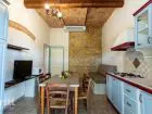 Die Wohnung befindet sich im Erdgeschoss und bietet einen hellen Wohnbereich mit Kochnische und einem bequemen Schlafsofa. Es gibt zwei Badezimmer und zwei Schlafzimmer, eines mit einem Doppelbett und eines mit zwei Einzelbetten. Über eine Treppe erreicht man das offene Schlafloft mit zwei zusätzlichen Betten, ideal für größere Familien. Die Einrichtung ist schlicht und authentisch und passt zur toskanischen Umgebung.
