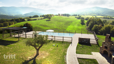 Die Villa bietet Platz für 16 Personen und besteht aus 2 geräumigen Wohnungen, die zusammen eine große Einheit bilden, die durch eine Innentreppe verbunden ist und genügend Wohnraum bietet, um mit einer großen Gruppe komfortabel zu wohnen. Im Erdgeschoss gibt es ein geräumiges Wohnzimmer mit TV-Ecke, Kamin, Esszimmer und eine Küche mit Ofen, Kühlschrank mit Gefrierfach, Geschirrspüler, Waschmaschine, Mikrowelle und Toaster. Es gibt vier Doppelzimmer mit eigenen Badezimmern, Dusche, Toilette und Bidet. Es gibt ein zusätzliches Gästebad. Die Toiletten im Erdgeschoss sind rollstuhlgerecht. Im ersten Stock gibt es ein Wohnzimmer mit Sitzecke, Esszimmer und Küche. Es gibt 4 Doppelzimmer, jedes mit eigenem Badezimmer sowie Dusche, Toilette und Bidet. Hier gibt es außerdem ein zusätzliches Gästebad. 2 zusätzliche Betten können im Erdgeschoss und 3 zusätzliche Betten im 1. Stock gegen Gebühr aufgestellt werden. Draußen befindet sich ein beheiztes privates Schwimmbecken mit Sonnenterrasse, Sonnenliege, Sonnenschirmen und einer Außendusche. Rund um die Villa gibt es mehrere Terrassen, darunter eine große Terrasse mit Veranda und eine erhöhte Terrasse mit Grill und Blick über die toskanischen Hügel. Der Garten bietet reichlich Platz für Kinder zum Spielen und entspannende Momente im Freien, außerdem stehen zwei Ziele zur Verfügung. Die Zufahrtsstraße zur 16-Personen-Ferienvilla ist eine unbefestigte Straße von etwa 2 km und leicht erreichbar.