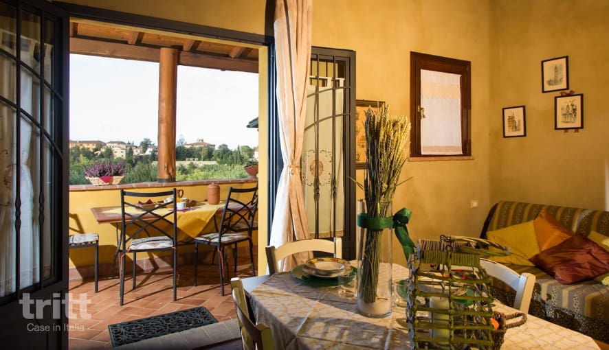 Das Apartment befindet sich auf der Ebene des Apartments und bietet einen Wohnbereich mit Doppelschlafsofa, Essbereich und eine voll ausgestattete Küchenzeile mit 3-Flammen-Herd (elektrisch), Kühlschrank mit Gefrierfach, Mikrowelle und Mokà (italienische Kaffeemaschine, kein Filter). Französische Türen führen auf die überdachte Terrasse, die einen Blick auf die toskanische Hügellandschaft bietet. Das Schlafzimmer verfügt über ein Doppelbett und ein Einzelschlafsofa, Sat-TV und Terrassentüren zum Garten des Bauernhofs. Das Badezimmer verfügt über eine Dusche, WC, Bidet, Waschbecken und Haartrockner. Die Terrasse, die sich durch die Bauweise gegen den Hügel auf einer höheren Ebene befindet, fungiert als überdachter Balkon mit herrlichem Ausblick.