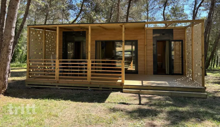 Dieser Bungalow ist komfortabel möbliert und klimatisiert. Im Inneren finden Sie ein Wohnzimmer mit Kochnische, ausgestattet mit Fernseher, Mikrowelle und Gefrierschrank. Es gibt zwei Schlafzimmer: eines mit einem Doppelbett und eines mit einem Einzelbett und einem Etagenbett. Das Badezimmer verfügt über Dusche, Toilette, Bidet und Waschbecken. Draußen gibt es eine Veranda mit Tisch und Stühlen, perfekt für ein italienisches Frühstück oder ein Glas Wein in der Abendsonne. Es gibt insgesamt zehn Bungalows dieses Typs. In der Hochsaison können Sie freitags, samstags, sonntags oder montags ankommen und gehen, was sehr flexibel ist. Im Zentrum des Grundstücks befindet sich ein großes, organisch geformtes Schwimmbecken (ca. 300 m², unbeheizt) mit einem flachen Bereich für Kinder und einem Hydromassagebereich. Die Atmosphäre ist entspannt und vertraut – ideal für Familien. Es gibt ein Fußballfeld, einen Tischtennistisch und Spielgeräte für die Kinder, und man kann an die Bar gehen, um ein Eis oder einen Drink zu trinken. Die Lage auf dem Hügel ermöglicht einen wunderschönen Blick über die toskanische Landschaft und eine angenehme Brise an heißen Tagen. Die Zufahrtsstraße ist ländlich und leicht ansteigend, was die Lage besonders charmant macht.