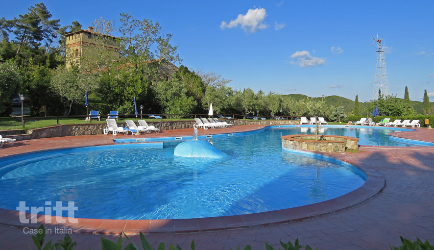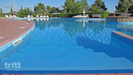 In der Mitte des Grundstücks befindet sich ein großer Swimmingpool von ca. 300 m² mit einem flachen Bereich für Kinder und Hydromassage. Liegestühle und Sonnenschirme sind rundherum ausgelegt, und im Schatten der Bäume gibt es viel Platz zum Entspannen oder Lesen eines Buches. Die Kinder vergnügen sich auf dem Spielfeld mit Fußballtoren, an der Tischtennisplatte oder an den Spielgeräten, während die Eltern an der Bar einen Drink oder ein Eis genießen. Die Lage auf dem Hügel sorgt für eine leichte Abkühlung am Abend und einen schönen Blick über die toskanische Landschaft. Die Wohnungen sind einfach, aber praktisch eingerichtet und mit Klimaanlage ausgestattet, damit Sie auch an heißen Sommertagen bequem übernachten können.