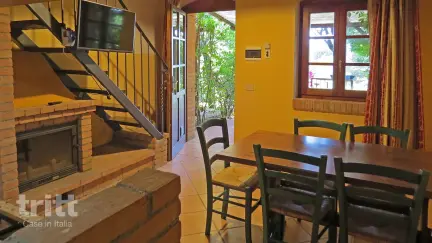 Auf dem mehr als 200 Hektar großen Grundstück, umgeben von Wäldern und Weinbergen, befinden sich fünf Gebäude mit insgesamt vierzig Wohnungen. Etwas weiter, in einem ruhigen Teil des Campingplatzes (ca. 350 Meter vom Pool entfernt), gibt es auch Glamping-Zelte und Bungalows für diejenigen, die etwas mehr Privatsphäre suchen. Der Komplex verfügt über einen großen, organisch geformten Pool von ca. 300 m² (unbeheizt) mit einem flachen Bereich für Kinder und Hydromassage. Diese großzügige Zweizimmerwohnung befindet sich im Erdgeschoss und verbindet rustikalen toskanischen Charme mit praktischem Komfort. Im Inneren finden Sie einen Wohnbereich mit Kamin, einen Essbereich und eine Küchenzeile mit Mikrowelle, Herd, Kühlschrank und Kaffeemaschine. Ein Fernseher ist ebenfalls vorhanden. Das Badezimmer verfügt über eine Dusche und ein Waschbecken.