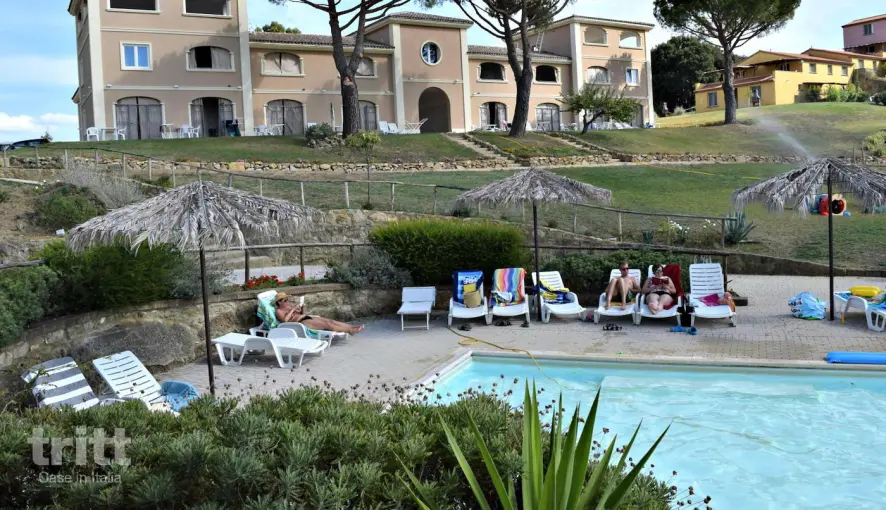 Die Agriresidence besteht aus 45 Wohnungen, verteilt auf mehrere Landhäuser. Die 4-Personen-Wohnung befindet sich im Erdgeschoss und verfügt über eine überdachte Terrasse mit Gartenmöbeln: perfekt, um draußen zu frühstücken oder den Sonnenuntergang mit einem Glas Wein zu genießen. Im Inneren finden Sie ein gemütliches Wohnzimmer mit Doppelschlafsofa, Essbereich und Küchenzeile, ein Schlafzimmer mit Doppelbett und ein offenes Schlafloft mit zwei Einzelbetten, das über eine Treppe erreichbar ist. Das Badezimmer verfügt über eine Dusche, WC und Bidet. Die Einrichtung ist im warmen toskanischen Stil mit Holzbalken und Fliesenböden gehalten. Die Unterkunft verfügt über zwei Salzwasserpools (unbeheizt), von denen einer über einen Kinderbereich verfügt. Rund um die Pools befindet sich eine großzügige Sonnenterrasse mit Liegestühlen, Sonnenschirmen und Außendusche. Neben dem Pool befindet sich ein Restaurant und eine Bar, wo Sie Kaffee, ein Getränk oder eine einfache toskanische Mahlzeit genießen können. Auf Anfrage ist auch ein italienisches Frühstück erhältlich. Für Kinder gibt es viel Spielbereich mit einer Tischtennisplatte, Spielgeräten und einem Teich mit Fischen und Fröschen an der Rezeption. Die Residenz ist über eine asphaltierte Straße leicht zu erreichen, komplett eingezäunt und mit einem Eingangstor ausgestattet.