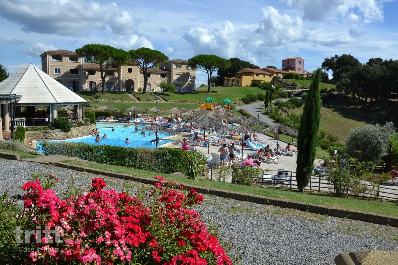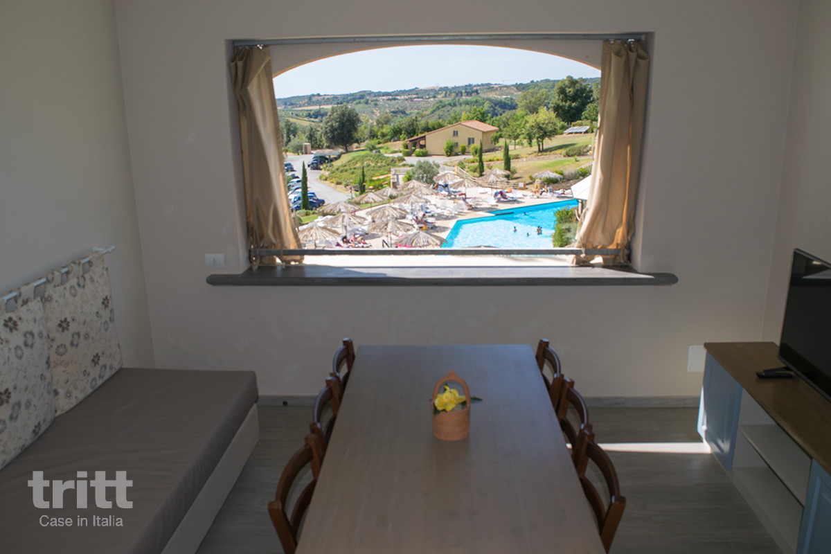 Im Inneren finden Sie ein helles Wohnzimmer mit Essbereich, Küchenzeile und Doppelschlafsofa, ein Schlafzimmer mit Doppelbett und ein zweites Schlafzimmer mit zwei Einzelbetten. Das Badezimmer verfügt über eine Dusche, WC und Bidet, und es gibt ein extra Zimmer mit WC. Ideal für größere Familien. Die Residenz verfügt über zwei Swimmingpools (unbeheizt), von denen einer über ein Kinderbecken verfügt. Es ist von einer großzügigen Sonnenterrasse mit Liegestühlen und Sonnenschirmen umgeben. Am Pool befindet sich ein Restaurant und eine Bar, die toskanische Küche und eine entspannte Atmosphäre bieten, perfekt für einen Drink in der Abendsonne. Für Kinder ist viel Unterhaltung geboten: eine Tischtennisplatte, Spielgeräte und sogar ein kleiner Teich mit Fischen und Fröschen an der Rezeption. Das Grundstück ist komplett eingezäunt und über ein verschlossenes Tor zugänglich.