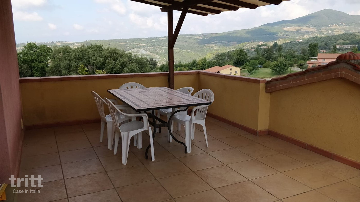 Die Residenz Vista Mare besteht aus 45 Wohnungen im warmen, ländlichen toskanischen Stil, mit Holzbalken und Terrakottaböden. Diese 6-Personen-Ferienwohnung befindet sich auf der Etage des Landhauses A und verfügt über einen teilweise überdachten Balkon mit Blick über die toskanische Landschaft. Im Inneren finden Sie ein helles Wohnzimmer mit Essbereich, Küchenzeile und Doppelschlafsofa, ein Badezimmer mit Dusche, WC und Bidet, und über die Treppe erreichen Sie die Schlafzimmeretage mit einem Schlafzimmer mit Doppelbett und einem Zimmer mit Etagenbetten: ideal für Familien. Das Anwesen verfügt über zwei Swimmingpools (unbeheizt), von denen einer über ein Kinderbecken verfügt. Rund um den Pool befindet sich eine große Sonnenterrasse mit Liegestühlen, Sonnenschirmen und einem schönen Blick auf das Meer. Für einen Drink oder ein italienisches Essen können Sie das Restaurant mit Bar besuchen, wo auch Frühstück möglich ist (auf Anfrage).