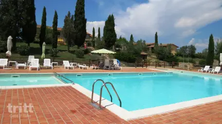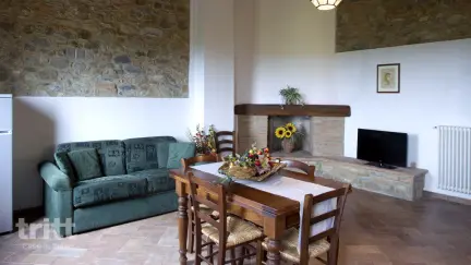 Das Anwesen besteht aus einem jahrhundertealten Hauptgebäude und einer ehemaligen Heuscheune, die zusammen 12 attraktiv eingerichtete Apartments ausmachen. Auf dem Grundstück gibt es ein geräumiges Schwimmbad mit separatem Kinderbecken, umgeben von einer sonnigen Terrasse mit Sonnenliege und Sonnenschirmen. Es gibt einen Indoor-Spielbereich für Kinder, während Sportbegeisterte im Kiefernwald neben dem Gelände Spaß haben werden, durch den sich Wander- und Joggingwege schlängeln. Vor dem Haupthaus befindet sich eine große, schattige Terrasse, die Sie mit den anderen Gästen teilen, komplett mit Sitzbereichen und mehreren Grillplätzen. In der Hochsaison wird ein wöchentlicher Abend mit Musik und Snacks organisiert, und man kann Wein oder lokales Olivenöl direkt von den Besitzern kaufen. Es gibt auch einen Brotservice, sodass Sie morgens mit frisch gebackenem Brot frühstücken können. Die Wohnung befindet sich im Erdgeschoss und verfügt über ein geräumiges Wohnzimmer mit Doppelsofa und Küche, ein Doppelzimmer und ein Badezimmer mit Dusche. Draußen gibt es einen Sitzbereich auf der großen Gemeinschaftsterrasse, ideal für einen entspannten Moment mit Blick auf die toskanische Landschaft.