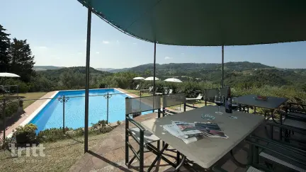 Diese geräumige Villa bietet Platz für 20 Personen und ist von einem vollständig eingezäunten Park mit jahrhundertealten Olivenbäumen und Zypressen umgeben. Im Erdgeschoss gibt es ein geräumiges Wohnzimmer mit Kamin und Sitzbereich sowie eine authentische Küche mit großem Kamin und Essbereich. Die Küche ist vollständig ausgestattet mit einem 6-Kocher-Herd, Ofen, Mikrowelle, Geschirrspüler und Waschmaschine. Auf dieser Etage gibt es außerdem zwei separate Toilettenräume. Das Erdgeschoss verfügt über 5 Doppelschlafzimmer, von denen 4 ein eigenes Badezimmer mit Dusche und Toilette haben, ergänzt durch ein zusätzliches separates Badezimmer mit Dusche und Toilette. Im zweiten Stock gibt es weitere fünf Doppelzimmer, von denen 4 ebenfalls ein eigenes Badezimmer und ein separates Badezimmer besitzen. Insgesamt gibt es 10 Schlafzimmer und 8 Badezimmer. Fünf Schlafzimmer sind klimatisiert und einige Räume haben spezielle handgemalte Deckenmalereien. Draußen befindet sich das private Schwimmbad mit Sonnenplattform, Sonnenliegen und Sonnenschirmen, von wo aus der Blick über die Hügel beeindruckend ist. Über das Gelände verteilt sind Sitzbereiche, ein Grillplatz und reichlich Platz zum Spielen, Spazierengehen oder Entspannen. Zusätzliche Betten sind auf Anfrage und gegen eine Gebühr (maximal 2) möglich. An der Villa gibt es einen privaten Parkplatz für bis zu 15 Autos. Erster Satz Bett, Badezimmer- und Küchenwäsche inklusive. Feldbett gegen Gebühr verfügbar. Verschiedene Dienstleistungen wie Frühstück, Mittag- und Abendessen sind auf Anfrage und gegen Gebühr verfügbar, ebenso wie die Möglichkeit, dass ein Hauskoch einen toskanischen Abend bereitstellt. Sie können schöne Spaziergänge durch das Anwesen durch die Olivenhaine und an der Kirche aus dem 18. Jahrhundert auf dem Anwesen