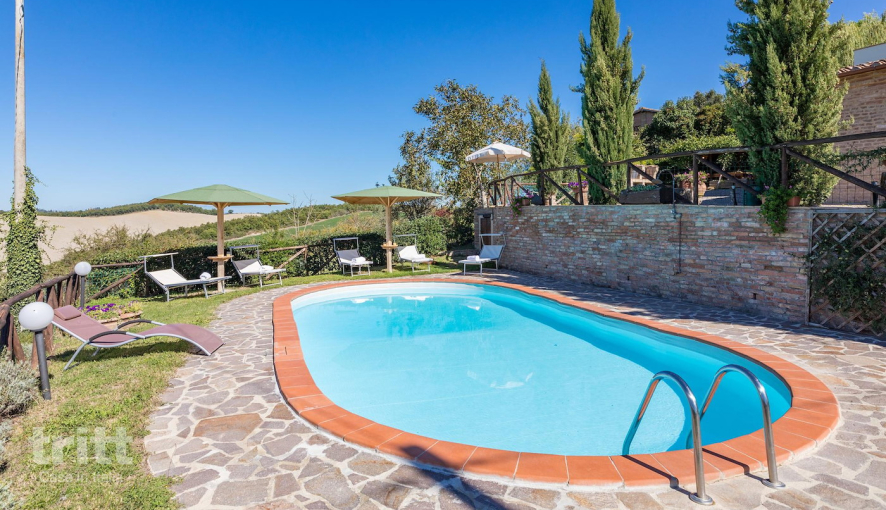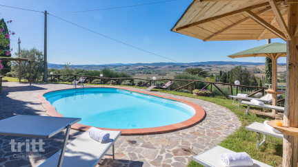 Dieser attraktive Ferienhof ist in mehrere komfortable Apartments unterteilt und bietet auch die Möglichkeit, zusammenzubleiben. Die geräumige Wohnung für 7 Personen befindet sich im ersten Stock und verfügt über einen eigenen Eingang, ein helles Wohnzimmer mit Kamin und mehrere Schlafzimmer mit privaten Badezimmern. Die Einrichtung ist typisch toskanisch und verbindet Charme mit Komfort, darunter Klimaanlage, WLAN und eine gut ausgestattete Küche. Draußen wartet ein privater Garten mit Pergola und Grill, während das gemeinsame Schwimmbecken im Garten zu entspannten Nachmittagen mit Blick auf die Landschaft und warmen Sonnenuntergängen einlädt.