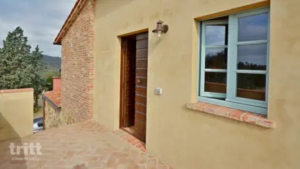. Die Wohnung ist Teil eines kleinen Resorts und hat eine warme toskanische Atmosphäre. Im Inneren betritt man ein helles Wohnzimmer mit Sitzecke, Kamin und Satellitenfernseher, das in einen Essbereich und eine voll ausgestattete Küche mit allen Annehmlichkeiten für Selbstversorger übergeht. Es gibt zwei Schlafzimmer, eines mit einem Doppelbett und eines mit zwei Einzelbetten, beide mit eigenem Bad, was zusätzliche Privatsphäre bietet. Draußen, oben an der Treppe zur Wohnung, befindet sich eine private Terrasse mit Gartenmöbeln. Im Gemeinschaftsgarten lädt ein höher gelegenes Salzwasser-Schwimmbecken zum Entspannen ein, mit wunderschönen Ausblicken auf die umliegende Landschaft.