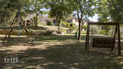 Die 4-Personen-Wohnung befindet sich im Erdgeschoss. Im Inneren finden Sie ein gemütliches Wohnzimmer mit einem Doppelsofa, Kamin und Essbereich. Die Küchenecke ist praktisch eingerichtet mit einem 4-Kocher-Herd, Geschirrspüler, Kühlschrank mit Gefrierfach, Mikrowelle, Ofen, Wasserkocher, Filterkaffeemaschine und einer Moka (italienische Kaffeemaschine). Es gibt ein separates Schlafzimmer mit Doppelbett und ein Badezimmer mit Dusche, Toilette und Waschmaschine. Das Badezimmer ist für Menschen mit Behinderung geeignet. Draußen verfügt die Wohnung über eine überdachte private Terrasse, ein schöner Ort, um die Ruhe und die Aussicht zu genießen. Die Wohnung ist von einem großzügigen Garten umgeben. Hier gibt es ein Schwimmbecken mit Panoramablick, einen Volleyballplatz und einen Tischtennistisch zur gemeinsamen Nutzung. Für Kinder gibt es Spielgeräte im Schatten der Bäume, und abends kann man den Gemeinschaftsgrill nutzen. Das Agriturismo ist von einem weitläufigen Garten mit vielen Oliven- und Kiefernbäumen umgeben. Die Besitzer produzieren unter anderem Olivenöl, wir empfehlen auf jeden Fall, dieses hausgemachte Olivenöl zu probieren und zu kaufen!