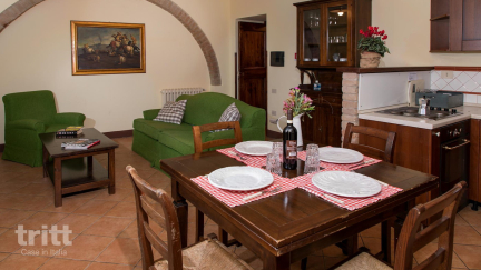 Auf dem Grundstück befindet sich Borgo Granaro, das zwischen den toskanischen Gärten liegt und mit einem Schwimmbad mit Kinderbecken, Spielgeräten, einem Tennisplatz und einem Fußballfeld ausgestattet ist. Diese geräumige 8-Personen-Wohnung verfügt über ein helles Wohnzimmer mit Küche und Essbereich, 3 Schlafzimmer und 2 Bäder. Für zusätzlichen Komfort wird eine Klimaanlage bereitgestellt. Draußen erlebt man die Stille und den Blick über die grüne Landschaft. Die Besitzer organisieren regelmäßig Pizzaabende und Verkostungen lokaler Produkte, und das Anwesen beherbergt eine Vielzahl von Nutztieren, die für eine authentische Atmosphäre sorgen.
