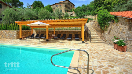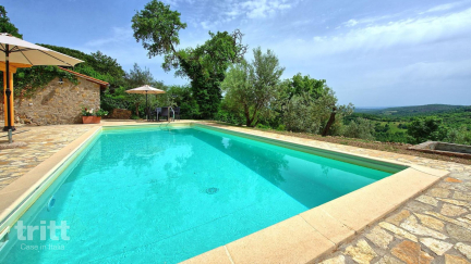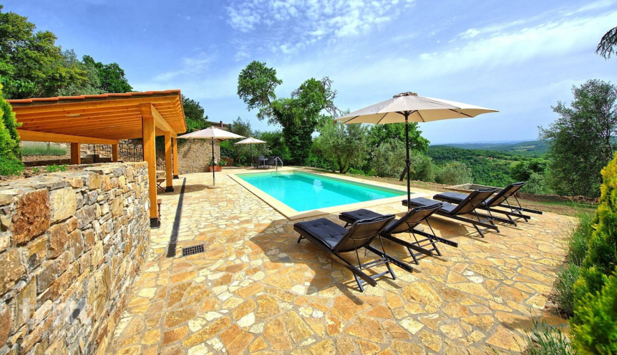 Dieses Ferienhaus bietet Platz für 12 Personen und erstreckt sich über 3 Etagen, sodass jeder viel Platz und Privatsphäre hat. Die Einrichtung ist zeitgenössisch und komfortabel, mit mehreren Wohnzimmern, einer großen Ess-in-Küche und insgesamt 6 Schlafzimmern. Einige der Schlafzimmer sind klimatisiert, was an heißen Sommertagen angenehm ist. Draußen befindet sich das private Schwimmbecken etwas tiefer im Garten, das über Treppen erreichbar ist, mit einem wunderschönen Blick über die Hügel. Rund um den Pool und unter der großzügigen Veranda gibt es schöne Orte, um in Sonne oder Schatten zu entspannen. Besonders besonders sind die große Terrasse im Erdgeschoss und die Dachterrasse, auf der man die Landschaft genießen und lange Abendessen im Freien bis zum Abend genießen kann.